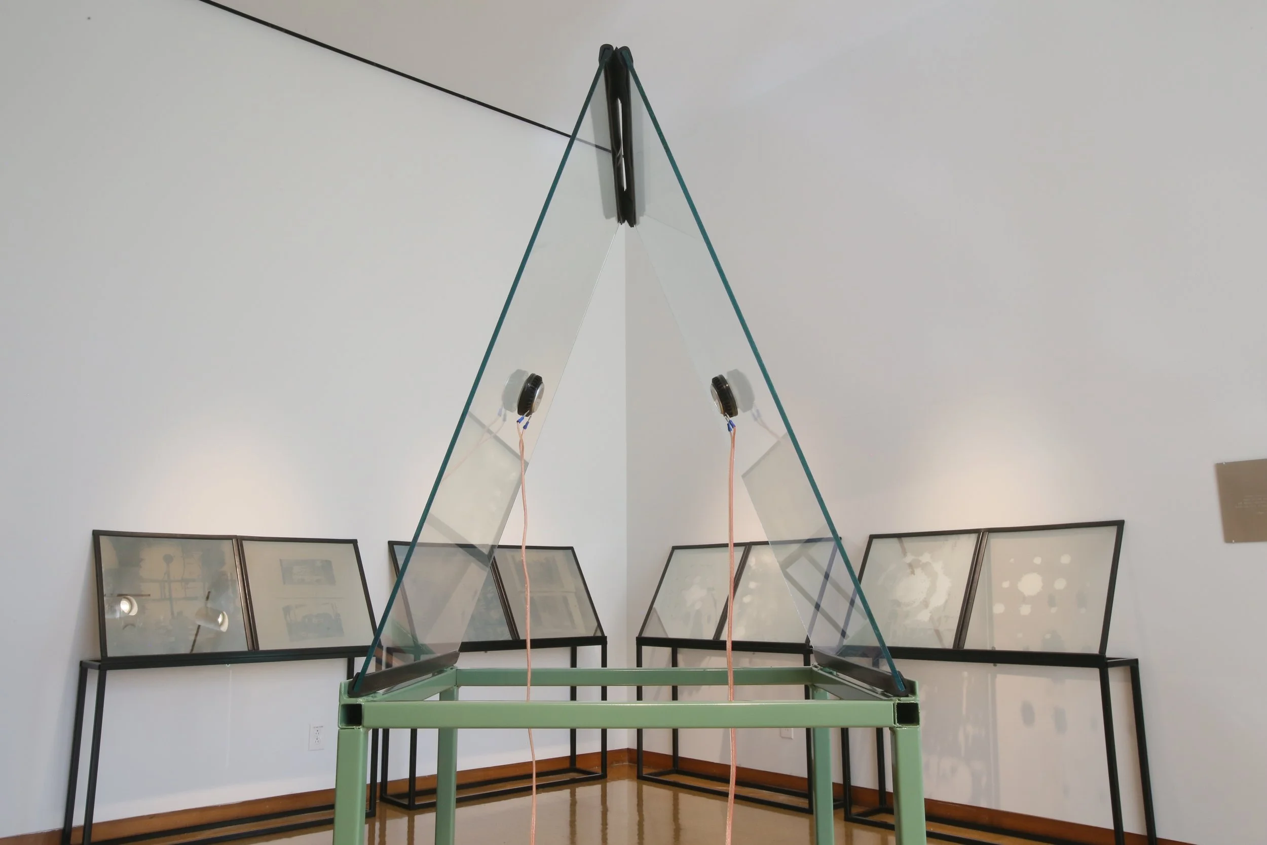 My grandfather Joseph D. Ryan worked for Libby Owens Ford in their Glass Research and Development Department from the 1930s-1960s, starting as a glass chemist and eventually becoming head of R&D. Researching his experiments, I became particularly intrigued by the wide range of tests he conducted for the US military in WWII, as well as the freewheeling experimental culture of the laboratory. “Resonance” draws from that atmosphere, pulling from images, notes, and sounds from the era to create a meditation on the process of investigative research. The structures of the installation are inspired by both his patent drawings and testing armatures from the laboratory.